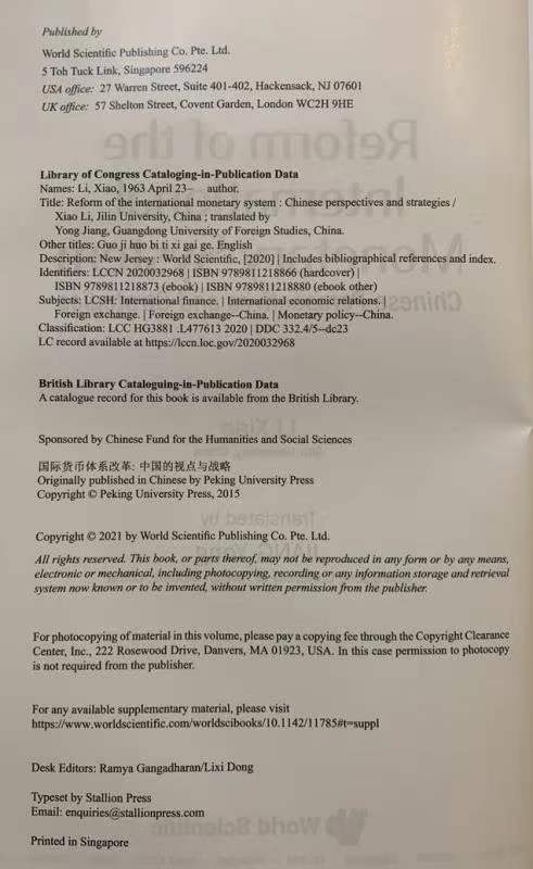 近期,3200威尼斯vip李晓教授专著《国际货币体系改革:中国的视点与战略》的英文版“Reform of the International Monetary System: Chinese Perspectives and Strategies”由国际著名的世界科技出版公司(World Scientific Publishing Co. Pte. Ltd.)于2021年7月正式出版发行。