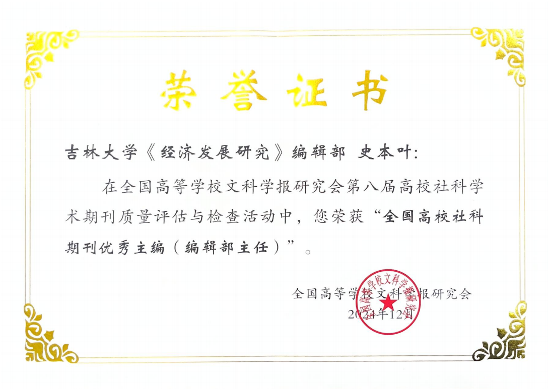 史本叶教授2013年从事期刊工作至今,先后担任《经济视角》编辑部主任、副主编和《经济发展研究》常务副主编。2022年12月,被评为“吉林省高校社科期刊优秀主编”。2024年12月,当选为吉林省高校社科期刊研究会常务理事。
