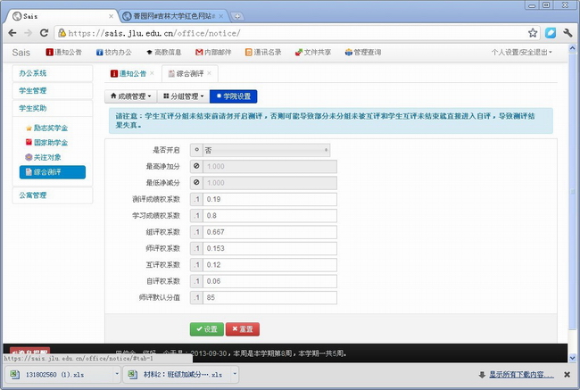 学生的综合素质成绩根据设置的指标获取(附件),满分为100分,最低分不得少于60分。测评时分为自评、互评、师评、组评四个部分。